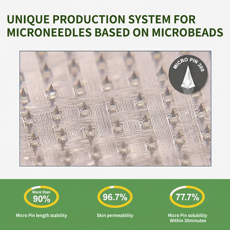 Cada aguja mide 0,27 mm de largo, apenas 1/7 del grosor de un cabello , y está hecha de medicamento soluble . Estas microagujas están diseñadas con precisión mediante técnicas de fabricación de vanguardia para garantizar una experiencia fluida e indolora, a la vez que administran eficazmente los ingredientes activos directamente en la piel.
